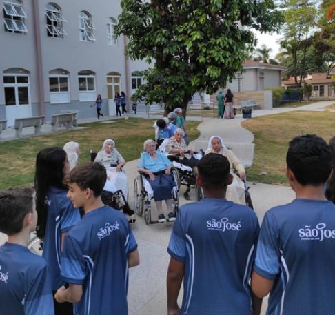 Alunos e educadores, recém chegados de viagem, visitaram e conversaram com as idosas, conhecendo os espaços e um pouco mais deste importante capítulo da história dos 130 anos da Congregação.
