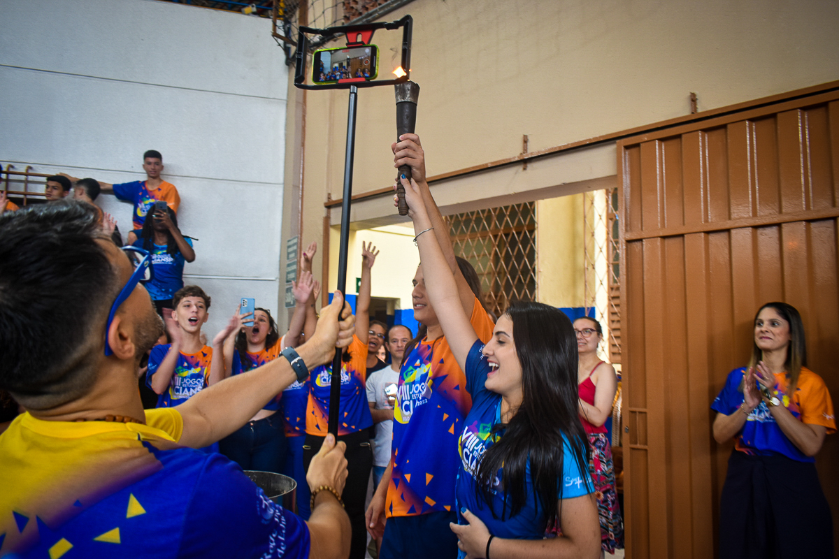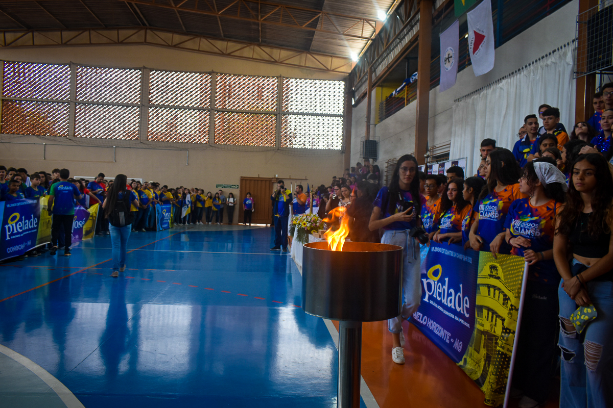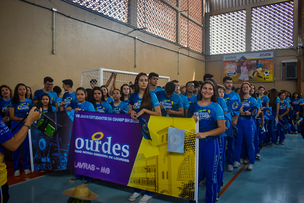 O dia em que o ginásio de esportes de um colégio se transformou no de sete! Após desfilarem pelas ruas ao redor do Colégio Piedade, as sete delegações vindas dos colégios que participam dos VIII Jogos Estudantis da CIANSP ocuparam o ginásio de esportes para a solenidade de abertura oficial do evento.