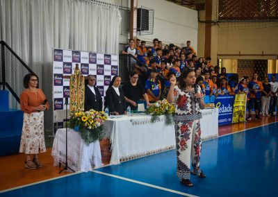 Irmã Wlaise Angélica, diretora anfitriã, conduziu o momento de oração apresentando a todos a cruz e estola que pertenceram a Monsenhor Domingos, fundador da CIANSP. A relíquia foi levada ao encontro de cada delegação pelas mãos de um estudante do Colégio Piedade. “Que lembremos sempre que somos todos convidados a sermos também missionários dos valores ensinados por Jesus Cristo”, explicou Irmã Wlaise.